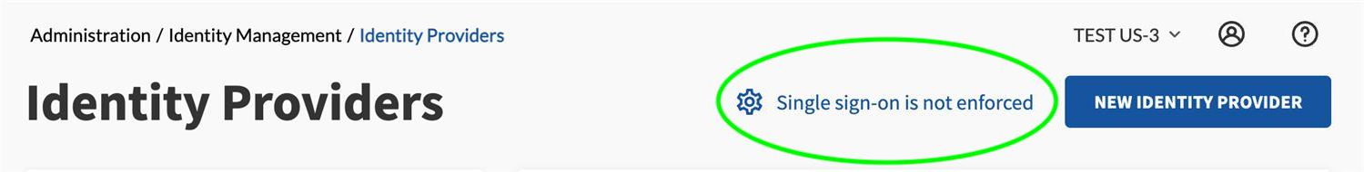 - Enable SSO enforcement. After an IdP has been set up in Flexera One, click the Single sign-on is not enforced settings option in the upper-right corner of the Identity Providers screen to enable SSO enforcement.