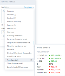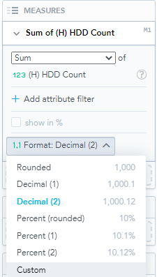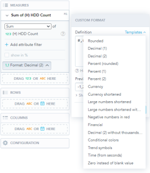 For every measure and attribute in your Measures section, you can configure your own custom format using specific syntax or select from a variety of predefined formats.